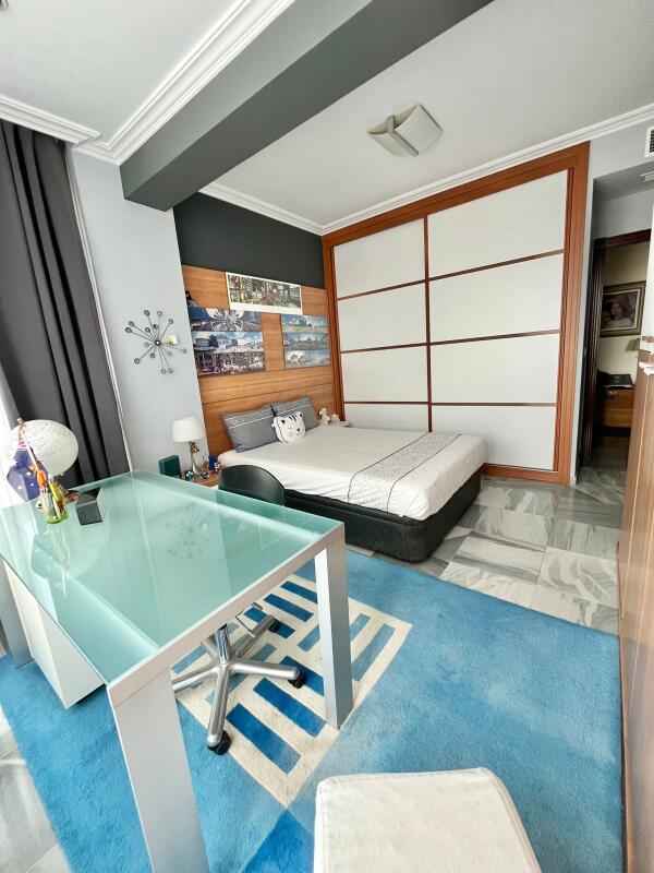 La distribución es cómoda y funcional, organizada en tres áreas diferenciadas desde el recibidor: al frente se sitúa un amplio y elegante salón-comedor de aproximadamente 70 m², presidido por una espectacular cristalera; a la derecha, la zona de descanso, compuesta por cinco dormitorios y tres baños, siendo el dormitorio principal en suite; y a la izquierda, las zonas comunes.