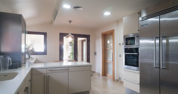 Chalet muy LUMINOSO, con un cuidado diseño de cada una de sus estancias con materiales de primera calidad y una CÓMODA DISTRIBUCIÓN en tres plantas: Dispone de 6 dormitorios muy amplios con sus baños, una maravillosa cocina con vistas al campo de golf y salida al porche y al comedor, la sala de estar esta dividida en tres ambientes, salon, sala de estar con chimenea y amplio comedor.